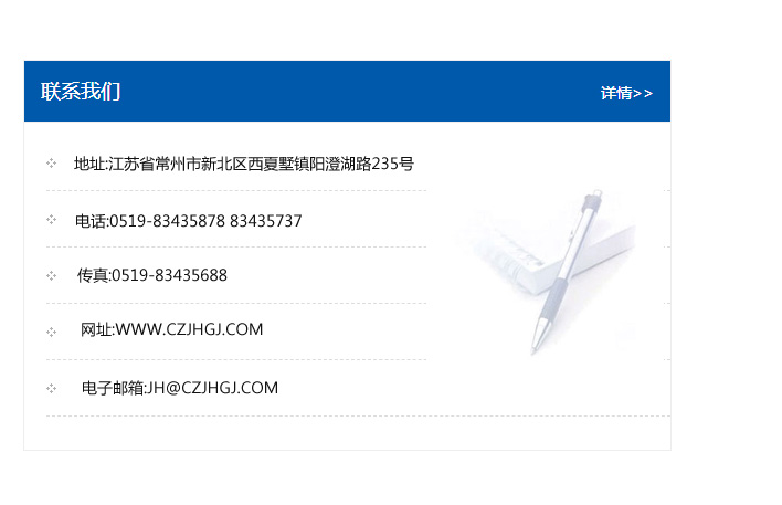 地址:常州市新北區友邦商務大廈1幢16、17層  電話:0519-85101652  傳真:0519-85112595  郵編:213022  網址:www.cz-jiayue_cn.sanjinoa.com  郵箱:xiajifengaa@163.com